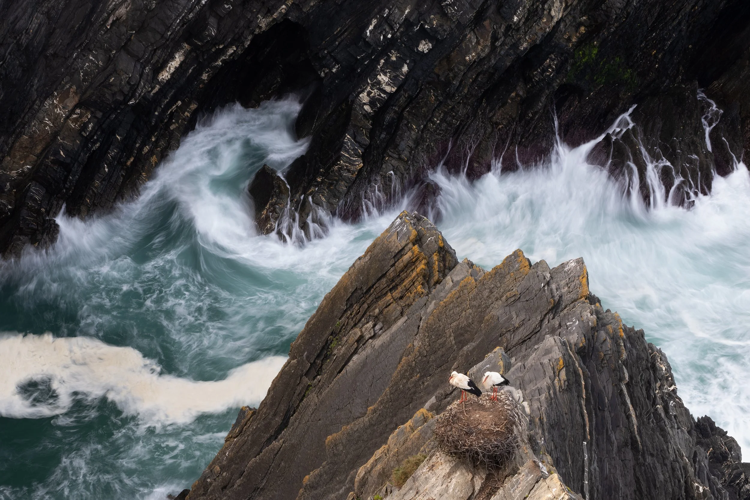 But it is along the Vicentine Coast that this relationship reaches an absolutely unique expression. Nowhere else in the world do white storks nest on sea cliffs. Here, they face Atlantic winds, salt spray, and the force of the ocean, occupying cliffs where the improbable has become routine. This exclusive behaviour is shaped by an extreme and singular territory.